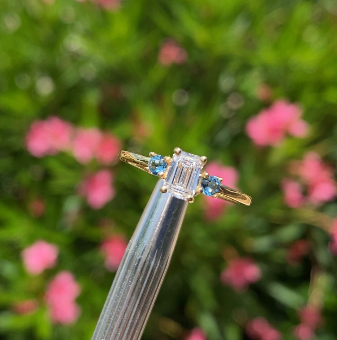 El Anillo Celeste destaca por su equilibrio entre elegancia moderna y dulzura atemporal. Su piedra central en corte esmeralda brilla con una pureza serena, mientras dos gemas laterales añaden un sutil toque de color y encanto.