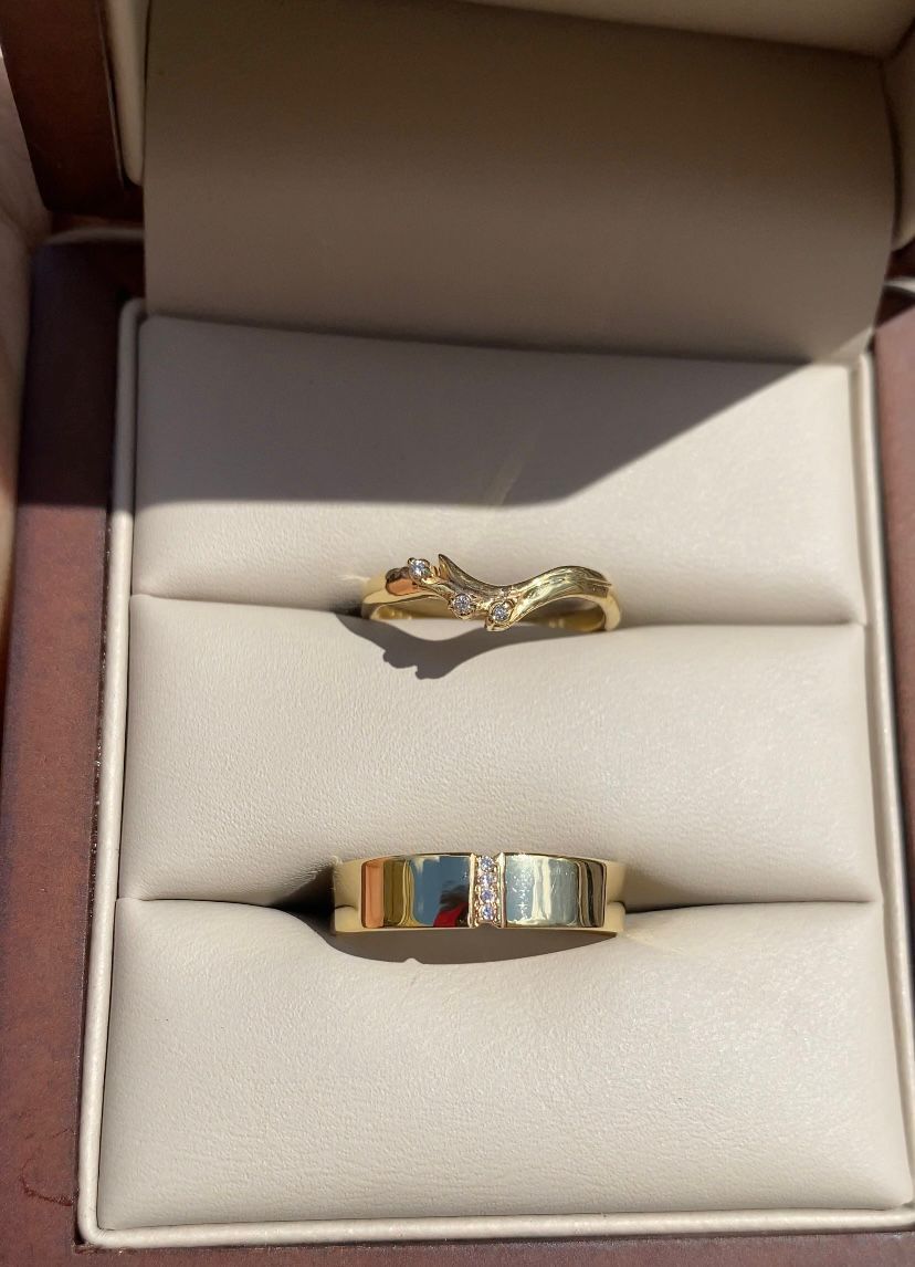 Un juego de anillos en oro de 10 kt con un diseño elegante y diferente: la argolla masculina lleva un detalle central de circonias que aporta brillo sutil, mientras que la argollita femenina tiene una forma ondulada que simboliza armonía y movimiento.